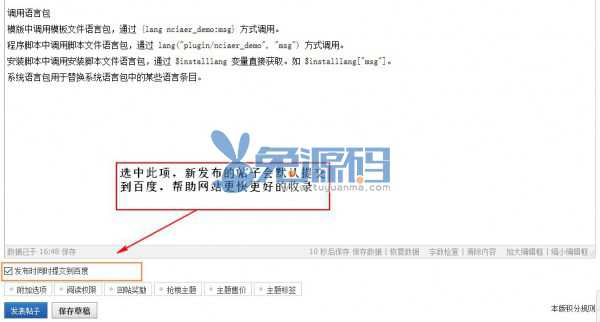 启用本插件后,在发帖的时候可以选择是否将新帖子推送到百度,选择推送到百度可以第一时间让百度收录本站内容,利于原创的保护,权重的提升,对于靠自然流量的站点来说,尤为重要!
